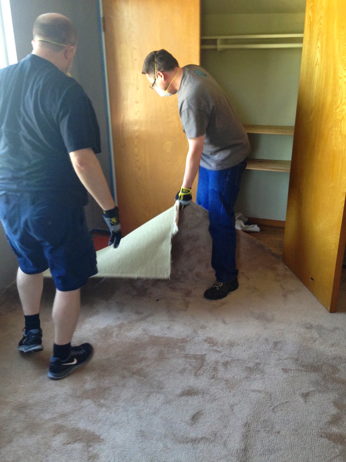 First we started with pulling the carpet padding, then the tack strips. This was a long and painful process. Throughout the whole procedure you are either on your knees or bent over pulling staples or using a crowbar to pry up tack strips. We were able to get 100% of the tack strips and 50% of the staples out over a 5 hour chunk of time from the upstairs. As it is now the Wednesday before move in date and that is still the state (for reasons I will state below), there is some concern over how clean / ready our place will be when our furniture moves in on Saturday. But there are a lot of hours between now and then, and we feel we can be ready.